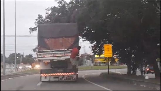 A cena foi registrada por volta de 18h30 de terça-feira (2), em uma das pistas da via que dá acesso à rodovia estadual RJ-216 (Campos-Farol). Não se sabe por quanto tempo o homem ficou pendurado no caminhão. Durante a gravação, que dura pouco mais de um minuto, o “acrobata” do caminhão chegou a descer por instantes, quando o veículo passa por um quebra-molas. Logo após, ele se pendura novamente e segue tranquilamente, apesar dos riscos de queda e de algum incidente.