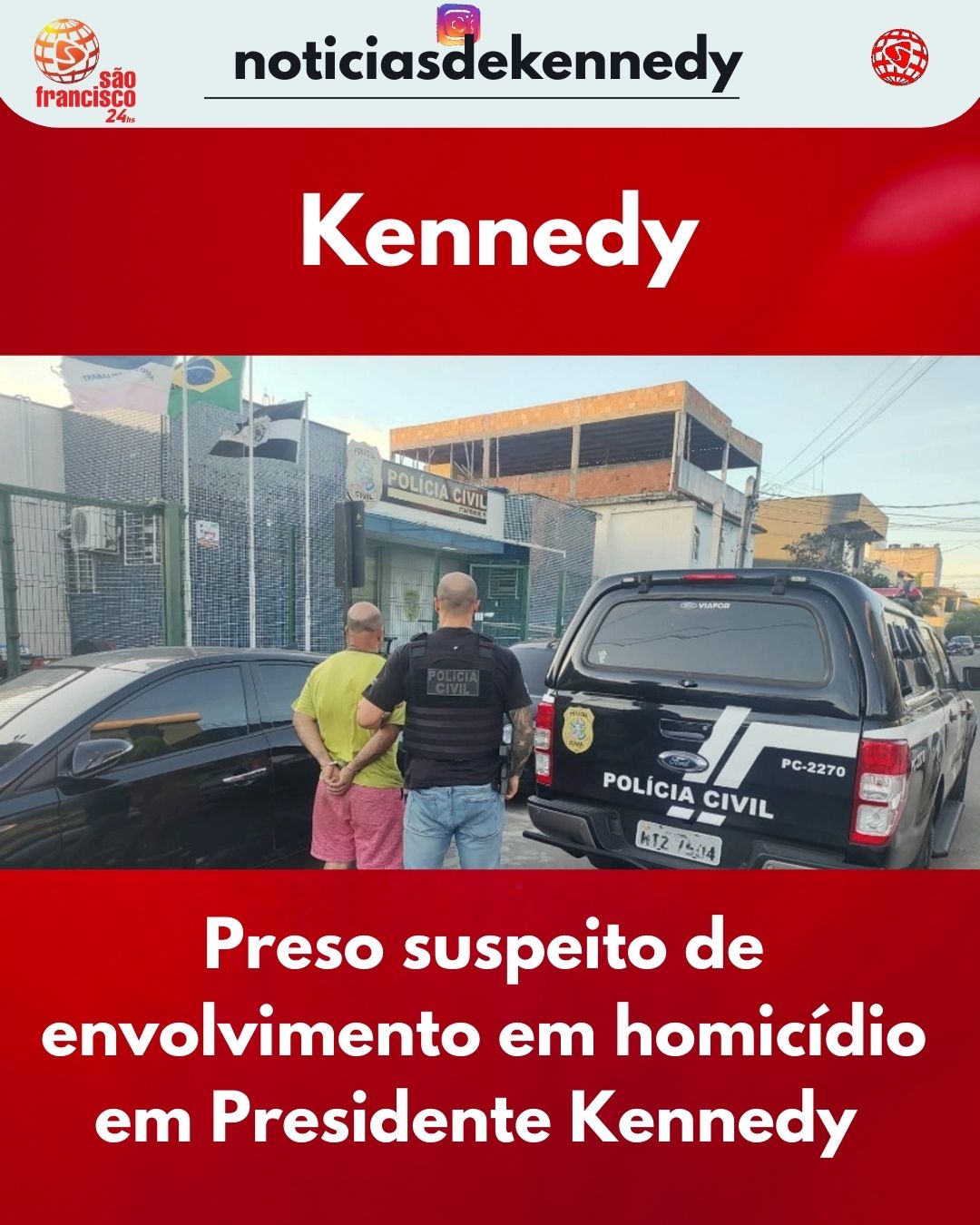 Na tarde desta quinta-feira (21) foi preso homem suspeito de envolvimento no assassinato de Iago Ângelo da Silva, 27 anos, crime ocorrido no Dia 02 deste mês, na localidade de Jaqueira, interior do município de Presidente Kennedy, sul do estado do Espírito Santo. Além da prisão preventiva de V.B.S.M., foram cumpridos três mandados de busca e apreensão, sendo um em Marataízes e dois em Presidente Kennedy.