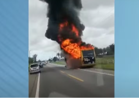 Imagens registradas por motoristas que passavam pela rodovia mostram o veículo completamente tomado pelo fogo e uma densa fumaça preta se espalhando pela pista.